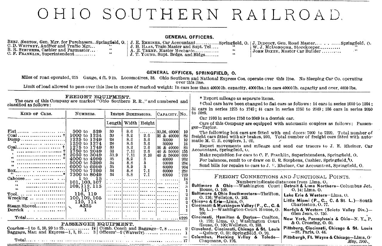 ORER Listing for Ohio Southern June 1900 ORER info courtesy Mark Plank