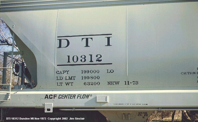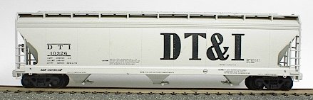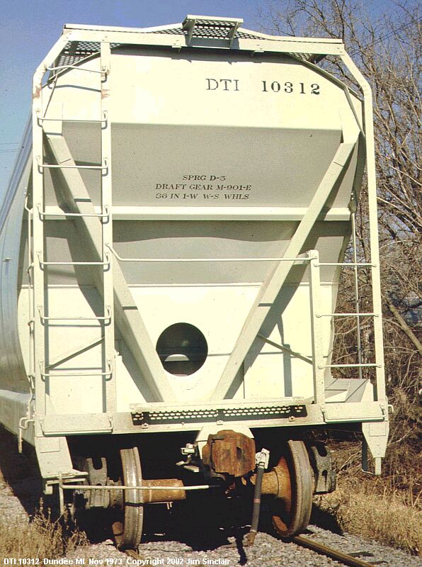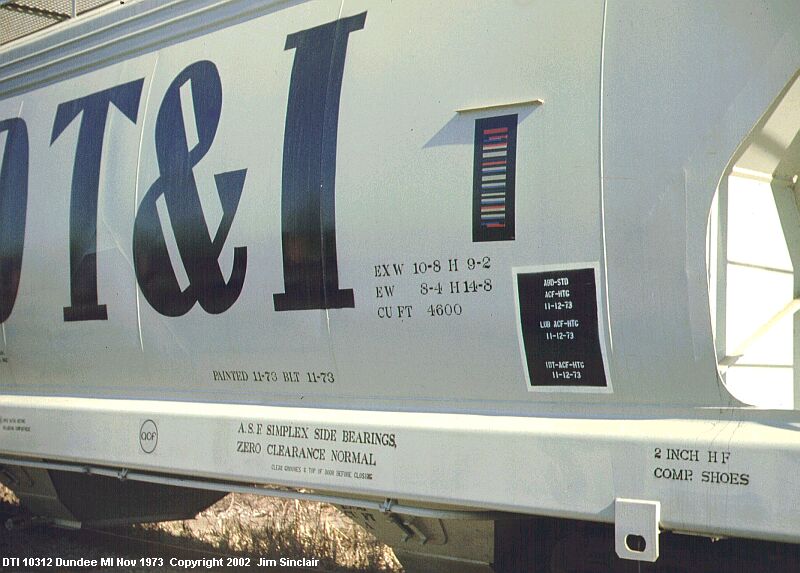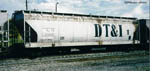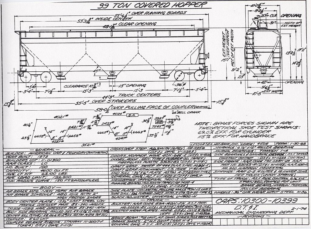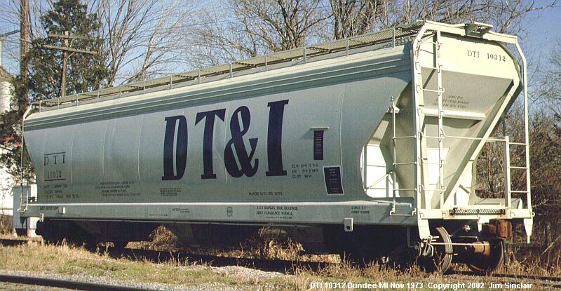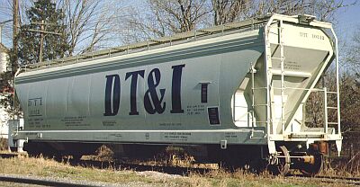 Equipment diagram courtesy Greg McDonnellAmerican Car & Foundry delivered 100 4600 cubic-foot covered hoppers to the DT&I in November 1973. They were painted grey-white and were used to carry grain.